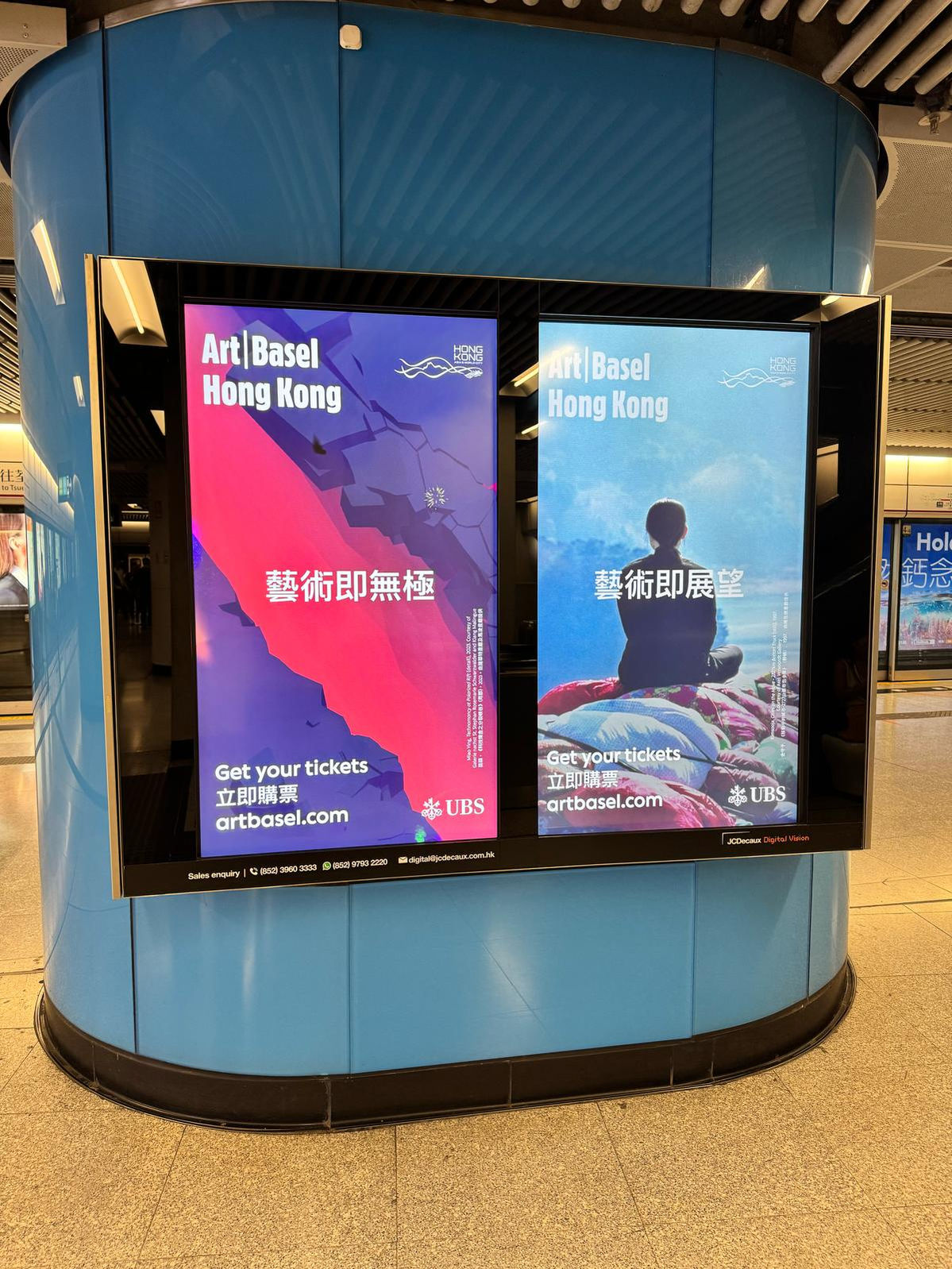 I developed the Art Basel Hong Kong Ad campaign across multiple platforms, including Metro digital displays, mid-level escalator displays, City Hall billboards, airport screens, bus and tram shelter displays, social media channels, and event floor plans.